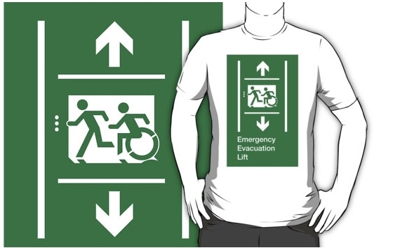 Accessible Exit Sign Project Wheelchair Wheelie Running Man Symbol Means of Egress Icon Disability Emergency Evacuation Fire Safety Lift Elevator Adult T-shirt 12